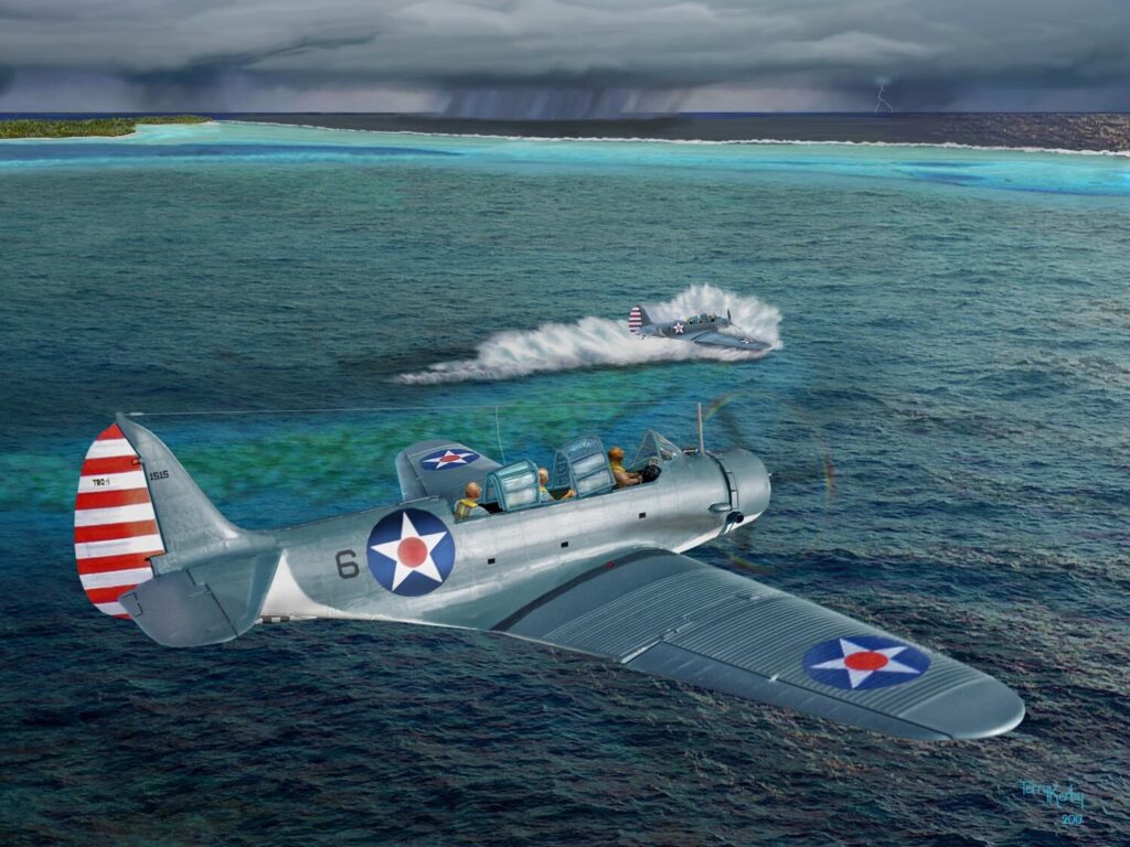Eight weeks after disaster struck at Pearl Harbor, American naval Aviators took the fight to the enemy for the first time in World War II. Admiral Chester Nimitz (Commander in Chief of the US Pacific Fleet) ordered a series of offensive operations in the Japanese-controlled Marshall Islands, beginning at Jaluit Atoll, administrative center of Imperial power in the region. Eleven Devastator bombers from Torpedo Squadron Five (VT-5) flew in the vanguard of a surprise raid on enemy shipping and shore installations at the remote island. Four of those aircraft failed to return, but two would be seen again more than 50 years later.