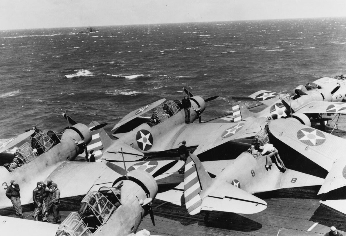 On reaching Jaluit, the attackers found their targets obscured by a low ceiling and passing squalls. The Devastators, which had been armed and configured for this mission as level bombers, were forced to drop below 1,000 feet to release their ordnance. Poor visibility frustrated the bombardiers’ aim and also hindered damage assessments (though post-war analysis of Japanese records indicates it was relatively light). Admiral Fletcher canceled a planned follow up assault due to the unfavorable weather conditions and challenging navigation. Some of the Yorktown’s planes reportedly landed back aboard the carrier after that morning’s sortie with only a couple gallons of fuel to spare.