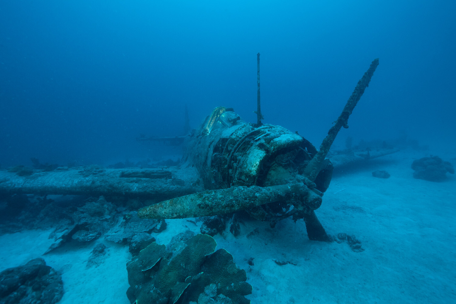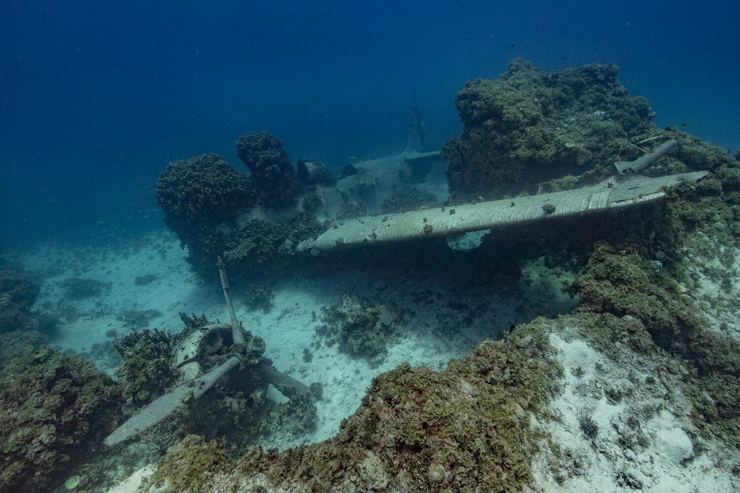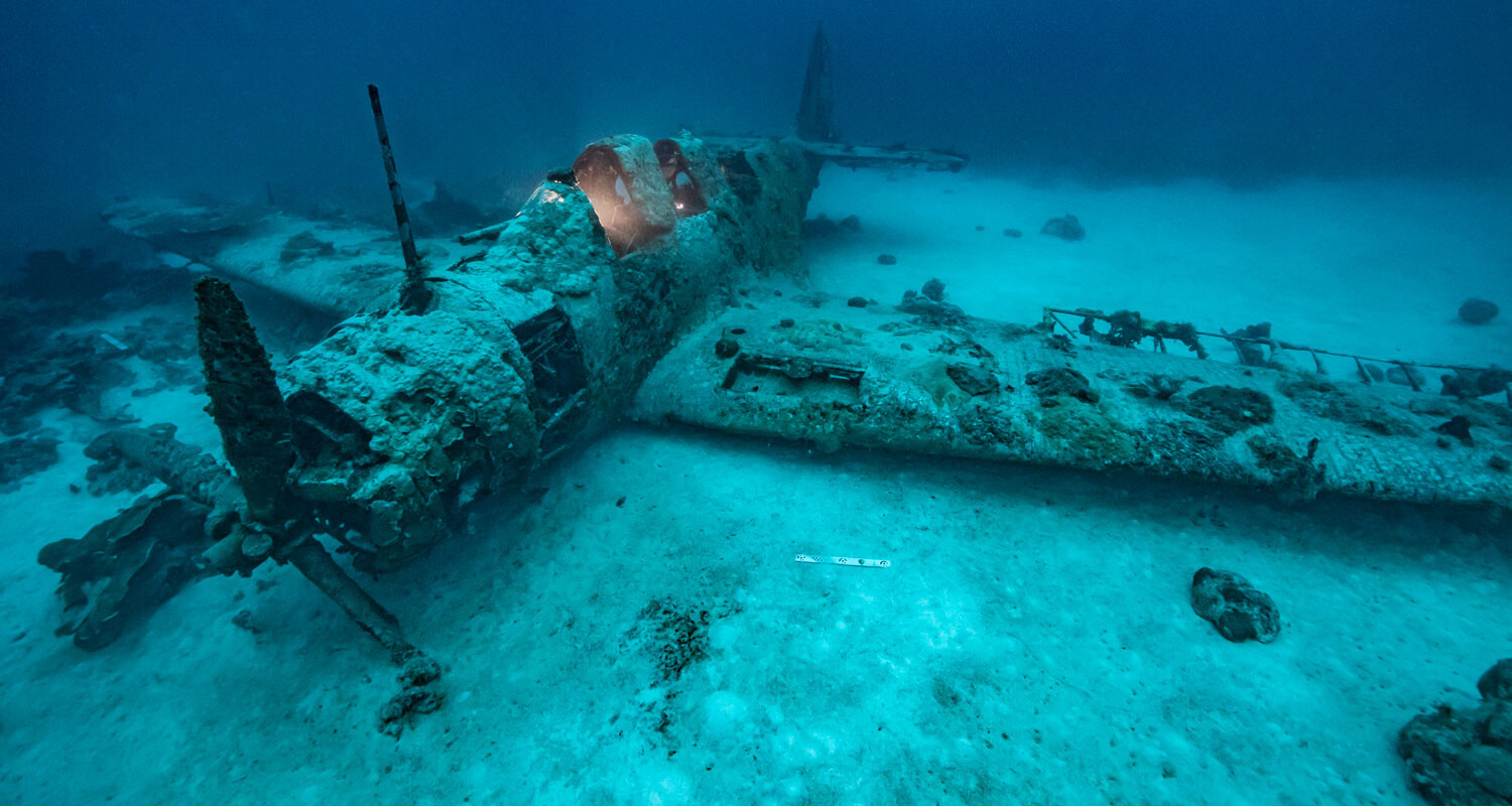 Often called “The Deep TBD,” in reference to its resting place roughly 120 feet beneath the surface Jaluit lagoon, the wreck lays level on a mostly sandy bottom with its starboard wing and a portion of the fuselage supported by some flat coral growth. Aside from the organic materials (such as fabric control surfaces and leather headrests) all of which were consumed by sea life and a few items missing since the initial ditching in WWII (like the tailwheel, flotation bag covers, bomb aimer’s door, Norden bombsight, and pilot’s map case) the airplane is almost entirely intact.