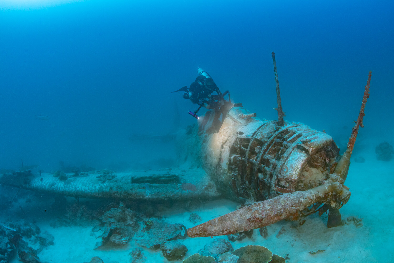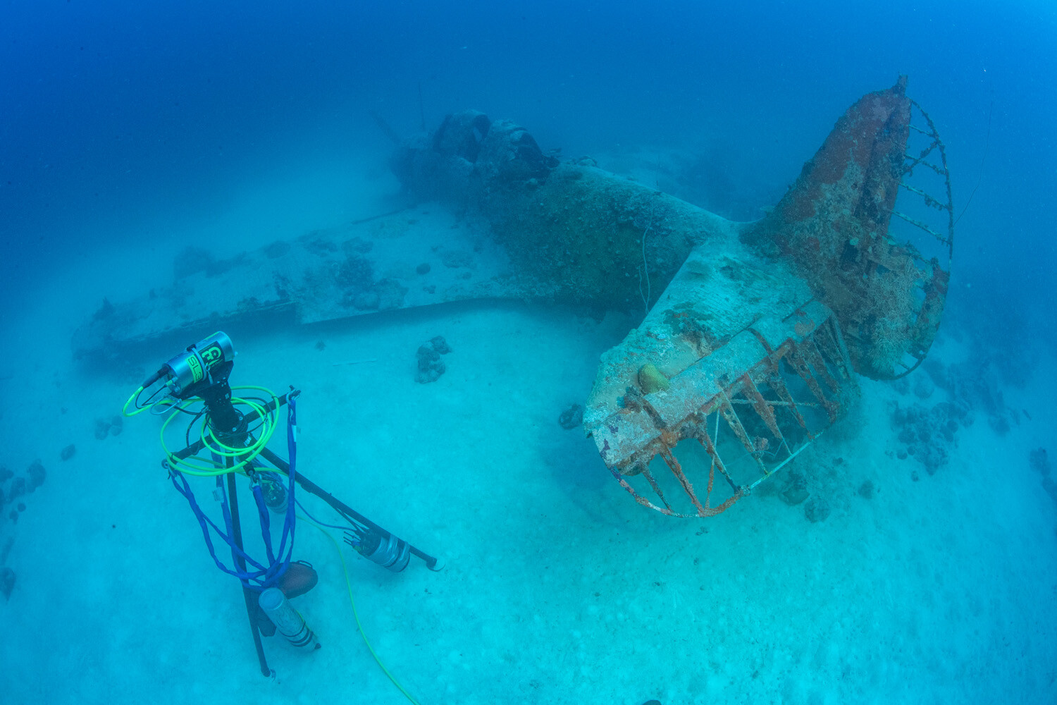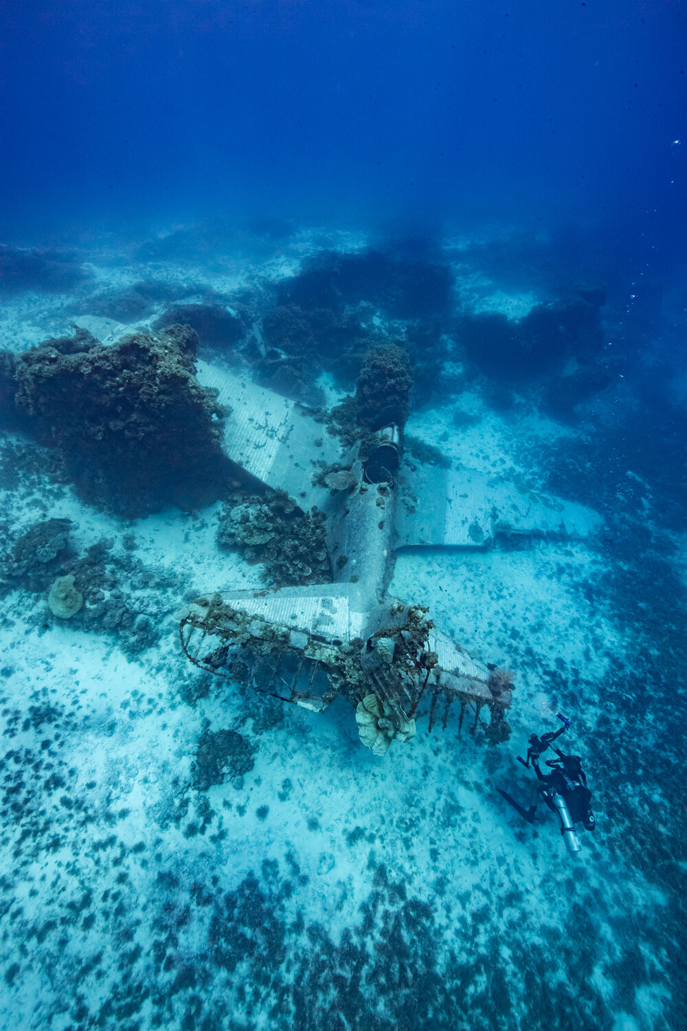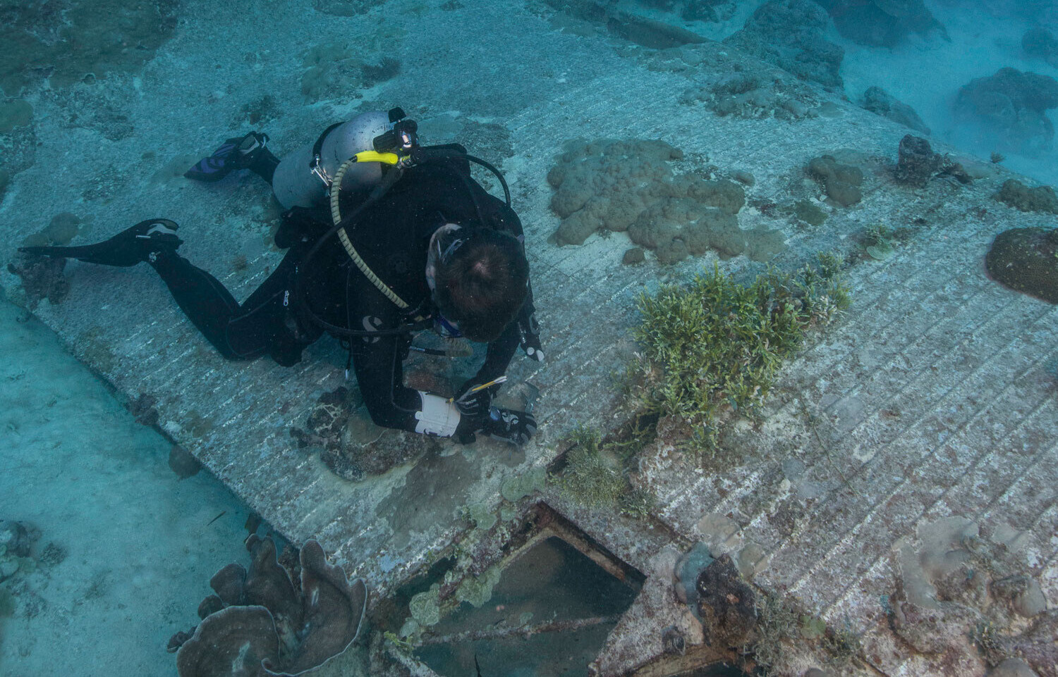 Its remarkable survival is likely attributable to a unique combination of factors; BuNo 1515’s position inside the lagoon and beyond the outer reef has sheltered it from storms and swells, while the greater depth means far less sunlight penetrates through the water column, in turn stunting the growth of corals and other marine organisms than can have an adverse effect on the manufactured structures. At the extreme edge of recreational diving, the deep site serves to limit the number of divers who can safely explore it. Devastator Project teams have rarely attempted such extensive work on the wreck without the reassurance of an onsite emergency decompression chamber.