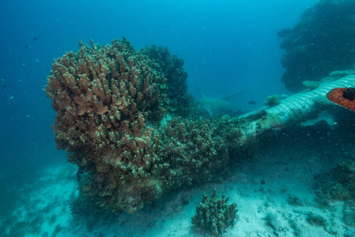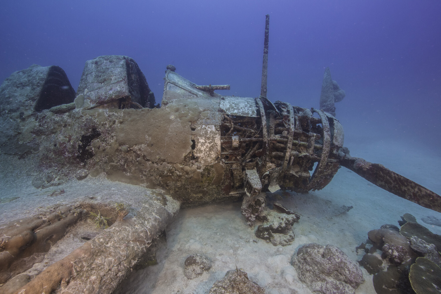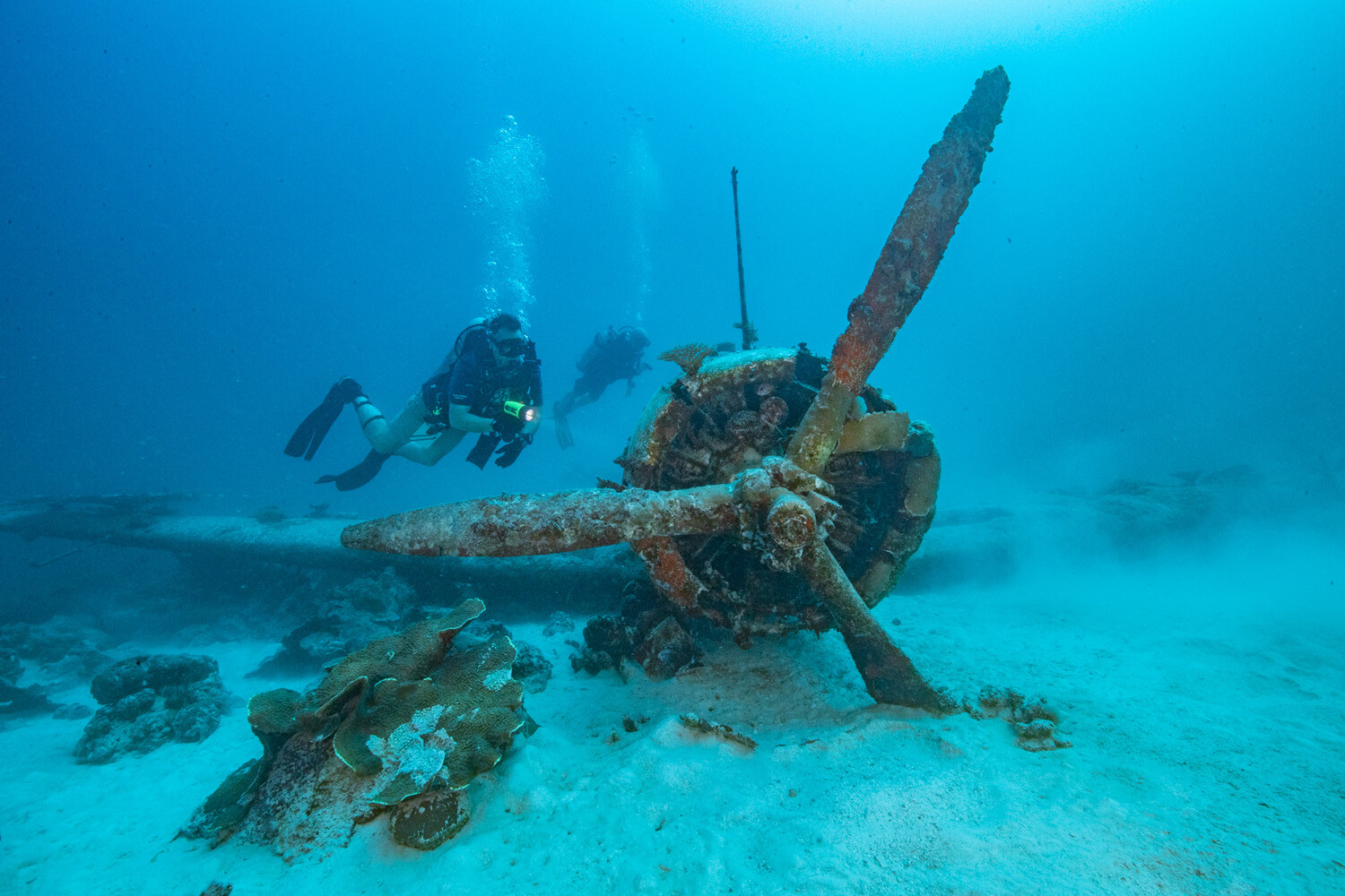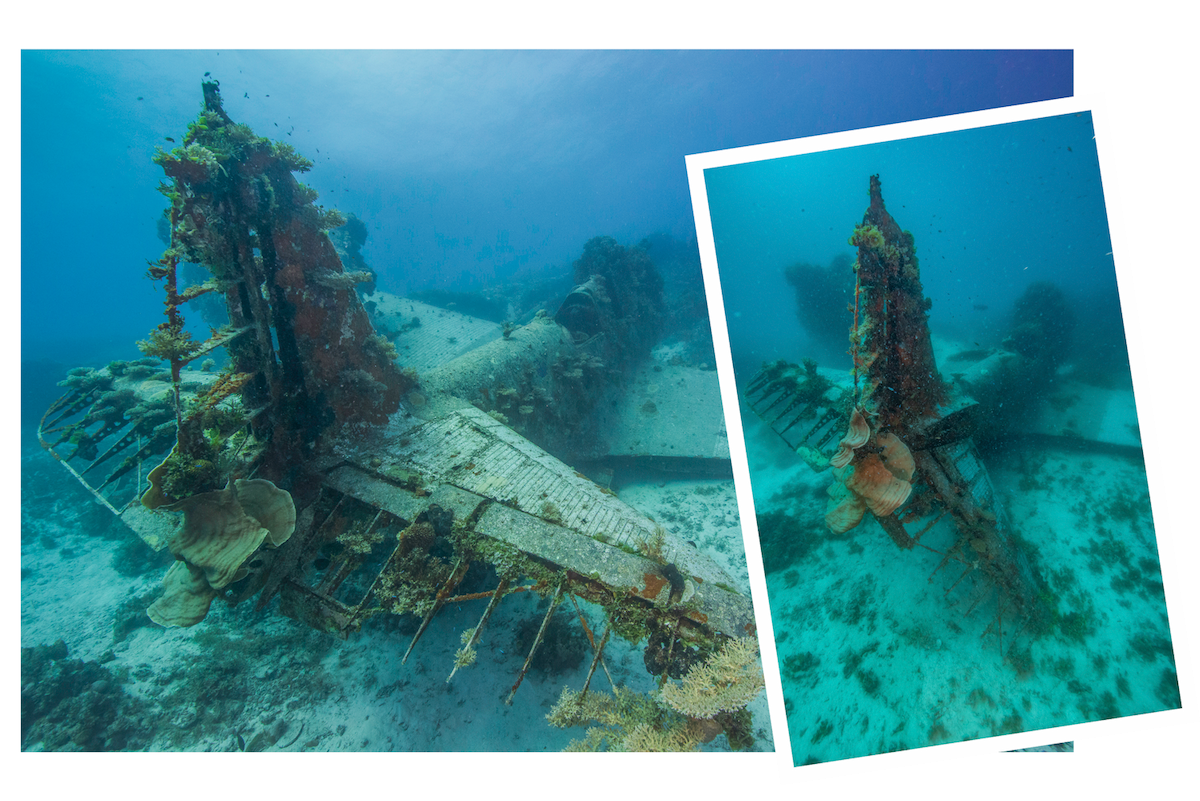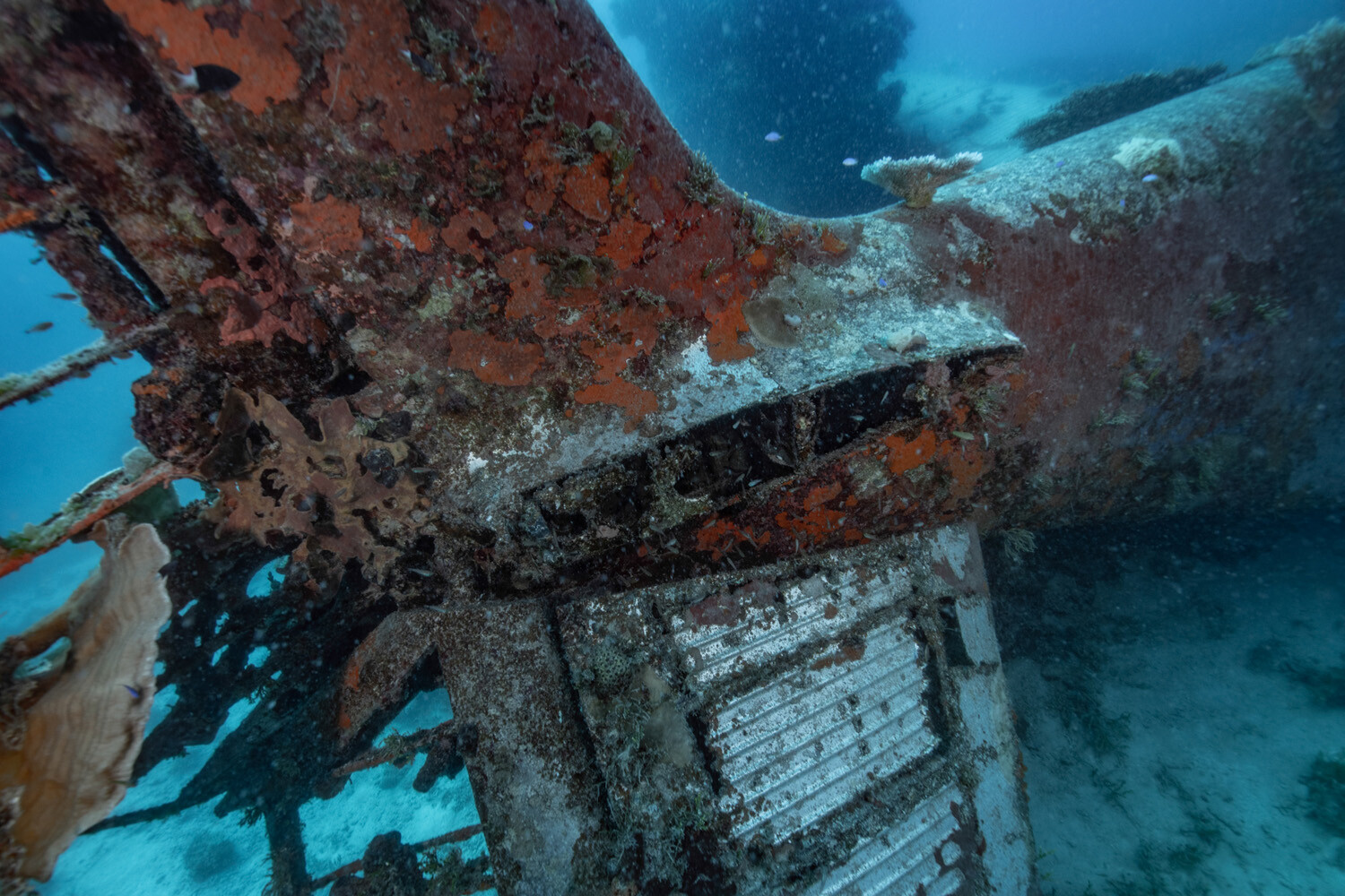 Its remarkable survival is likely attributable to a unique combination of factors; BuNo 1515’s position inside the lagoon and beyond the outer reef has sheltered it from storms and swells, while the greater depth means far less sunlight penetrates through the water column, in turn stunting the growth of corals and other marine organisms than can have an adverse effect on the manufactured structures. At the extreme edge of recreational diving, the deep site serves to limit the number of divers who can safely explore it. Devastator Project teams have rarely attempted such extensive work on the wreck without the reassurance of an onsite emergency decompression chamber.