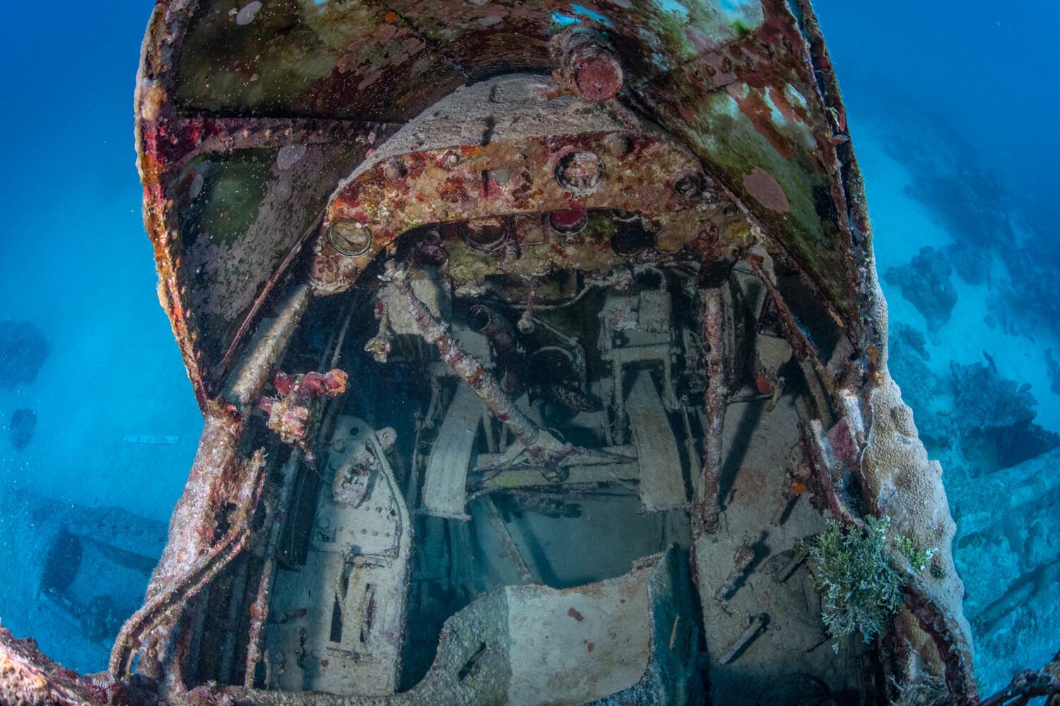 Just as the residents of Jaluit once cared for the stranded US Navy fliers, so have their children and grandchildren helped to safeguard the now historic warplanes through local vigilance and the robust national antiquities protection measures enacted in the Republic of the Marshall Islands (RMI). It turns out that by far the greatest impact on the submerged aircraft (and most especially BuNo 0298) through the intervening years has come not as the result of human interaction, but from the forces of Nature. While large swaths of the outer wing and fuselage skins on 5-T-7 remain cleanly pristine, other sections of the plane’s structure have been heavily colonized by stony (Pocillopora) corals. When the wreck was first characterized by National Park Service (NPS) divers in 1997, a couch-cushion sized coral growth was noted as having taken root, perched on the nose at the base of the radio antenna mast. Subsequent surveys by the Devastator Project team have tracked and documented its steadily accelerating expansion. As of the most recent dives (on 1 and 2 May 2023) the coral has grown exponentially, subsuming the radio mast as well as the pilot’s windscreen, completely covering the nose, nearly closing off access to the forward cockpit, and making significant inroads towards enveloping the auxiliary pilot/bombardier’s central crew position as well.